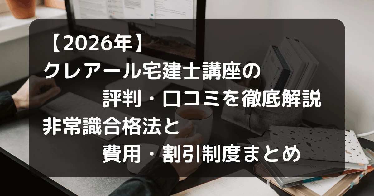 ここでは、2026年のクレアール宅建士講座の特徴・費用・割引制度・口コミを中心に、他講座と比較検討するために必要な情報を分かりやすくまとめています。
